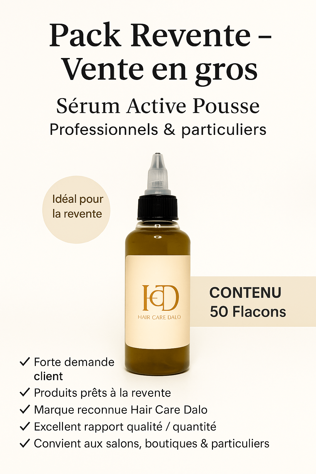 Le Pack Revente – 50 Sérums Active Pousse Hair Care Dalo est idéal pour les revendeurs souhaitant proposer un produit capillaire efficace, naturel et très demandé.